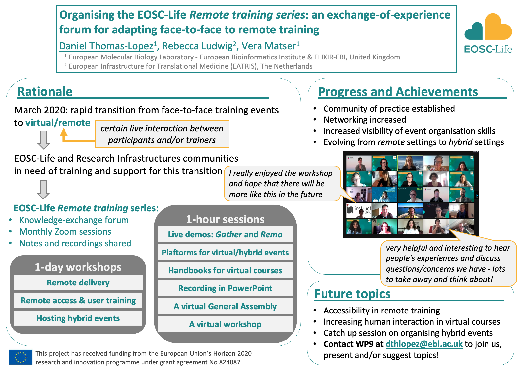 The COVID-19 pandemic resulted in a sudden transition from face-to-face to remote training. EOSC-Life has recently presented at ISMB 2021 the series of knowledge-exchange sessions on transitioning to remote events that was developed to support the EOSC-Life and Research Infrastructures (RI) community of Life Science trainers and organisers.